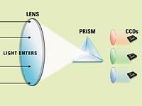 Notice also that the photosensitive cell has no sensitivity to color. It accumulates its charge regardless of the color of light that strikes its surface. To produce color images, filters are placed in front of the cells so that some of them see red, some see blue and some see green light. This can be done with a single CCD and a complex red, green and blue lens-filter assembly, or by using three separate CCDs with a single color filter over each (see Figure 3).