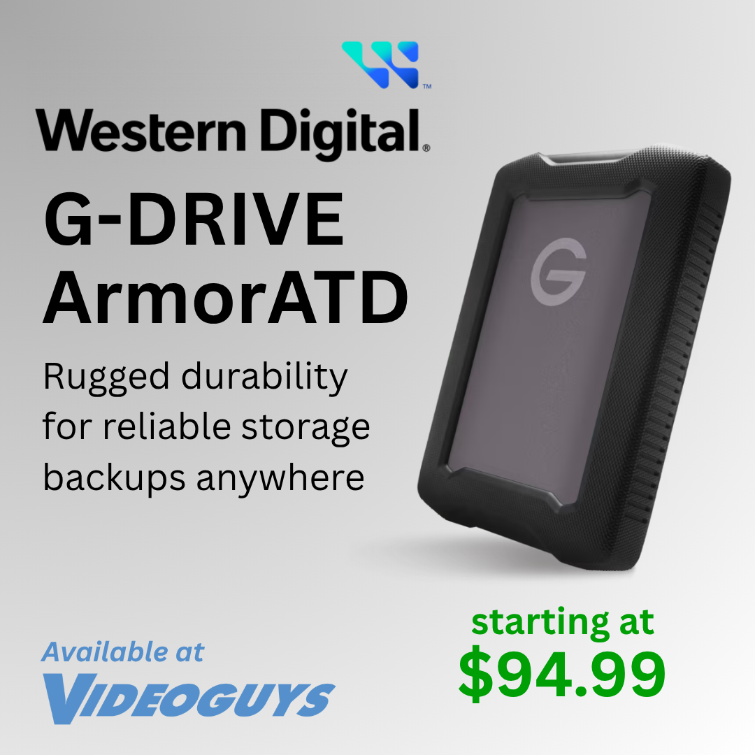 G-DRIVE ArmorATD is a rugged and reliable drive built for creators who need dependable backups anywhere they go. Built for the demands of travel and outdoor production, this all-terrain drive combines a premium anodized aluminum enclosure with an easy-to-grip protective bumper and IP54-rated rain and dust resistance. With USBc transfer speeds up to 130MB/s, you can quickly back up photos, video footage, and essential files whether you’re in the field or back in the studio. Designed for professionals who need both capacity and confidence, the G-DRIVE ArmorATD is available now at Videoguys starting at just $94.99. Learn more.