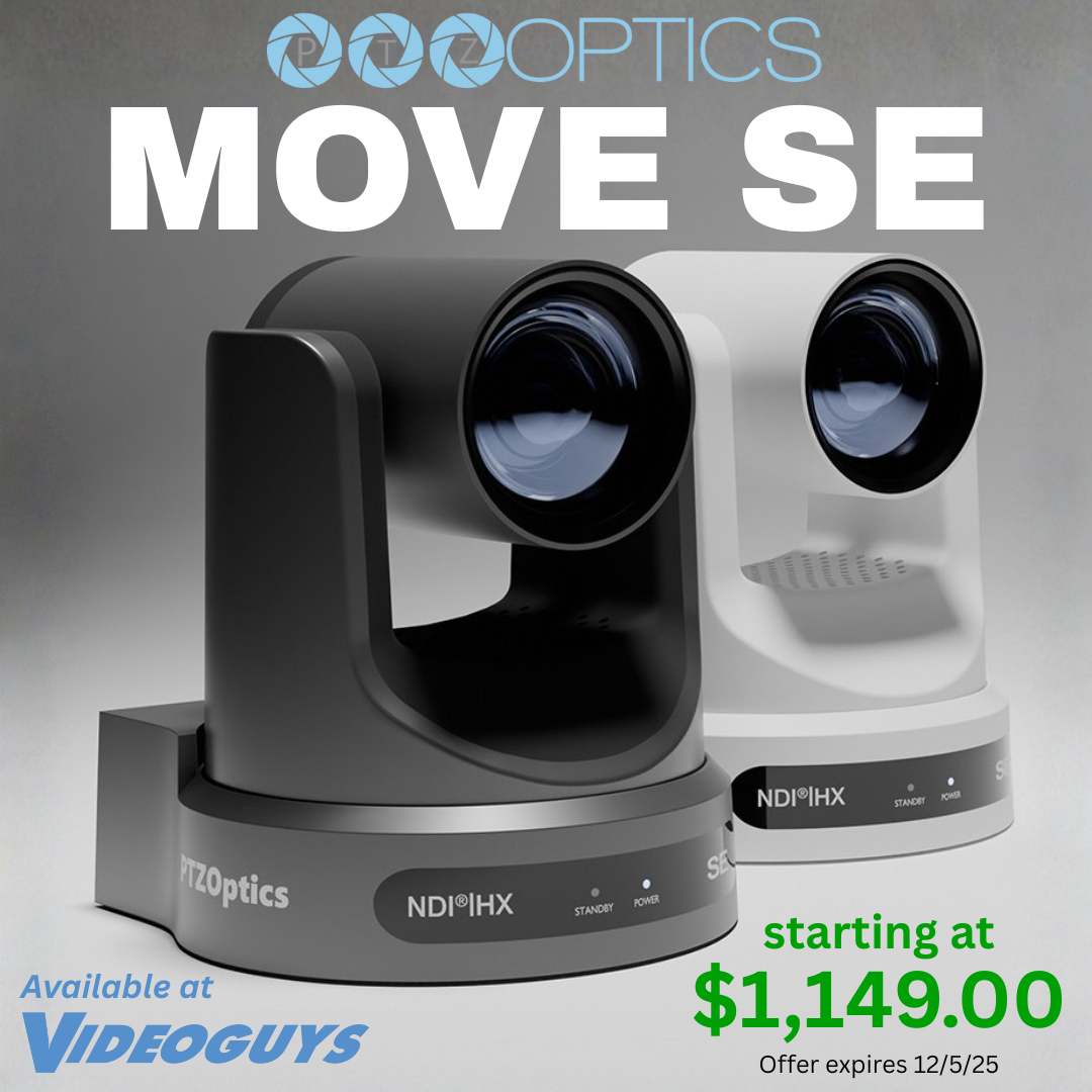PTZOptics Move SE PTZ Camera brings professional auto-tracking and broadcast-quality video to any production setup at an accessible price. Featuring HDMI, SDI, USB, IP, and native NDI outputs, it offers flexible connectivity for live streaming and video production workflows. Capture stunning 1080p video at 60fps with SONY CMOS image sensors that deliver exceptional performance, even in low light. Available in 12x, 20x, and 30x optical zoom options with PoE support, the Move SE adapts to any environment. Available at Videoguys starting at just $1,149 through December 5th, 2025. Learn more.