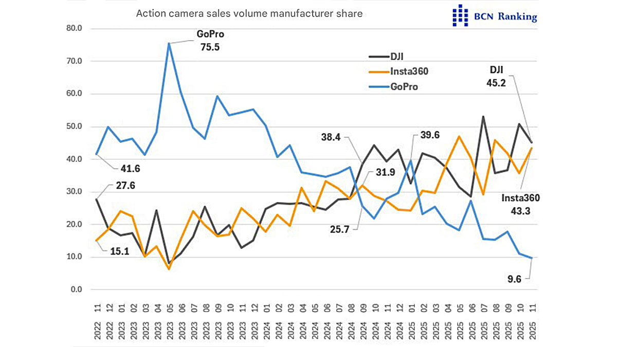 BCN Retail published an article by Ichiro Michikoshi about action cameras on its website at the end of December 2025. The article stated that GoPro’s domination of the action camera market peaked at 75.5% back in May 2023. At the start of 2025 the company still had the biggest market share at 39.6%. However, since then things have sadly gone downhill. Only 11 months later, in November 2025, GoPro’s market share had plummeted to only 9.6%.