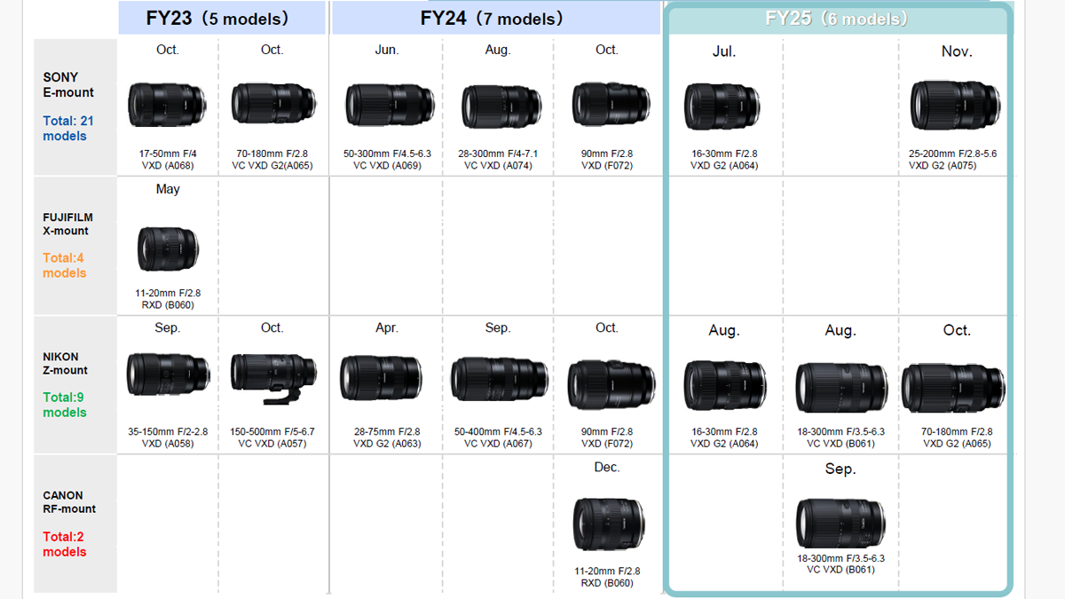 Tamron launched six new lenses under its own brand in 2025. These included the 16-30mm F/2.8 VXD G2 (A064), the 25-200mm F/2.8-5.6 VXD G2 (A075) and the 18-300mm F/3.5-6.3 VC VXD (B061). The company also released a Nikon Z mount version of its 70-180mm F/2.8 VXD G2 (A065) lens. While Tamron only launched five new lenses in 2023, it had seven new models in 2024, so the figure of six last year was a slight drop. However, the company’s new Medium-Term Management Plan (MTMP) targets 10 new model launches per year by 2026.
