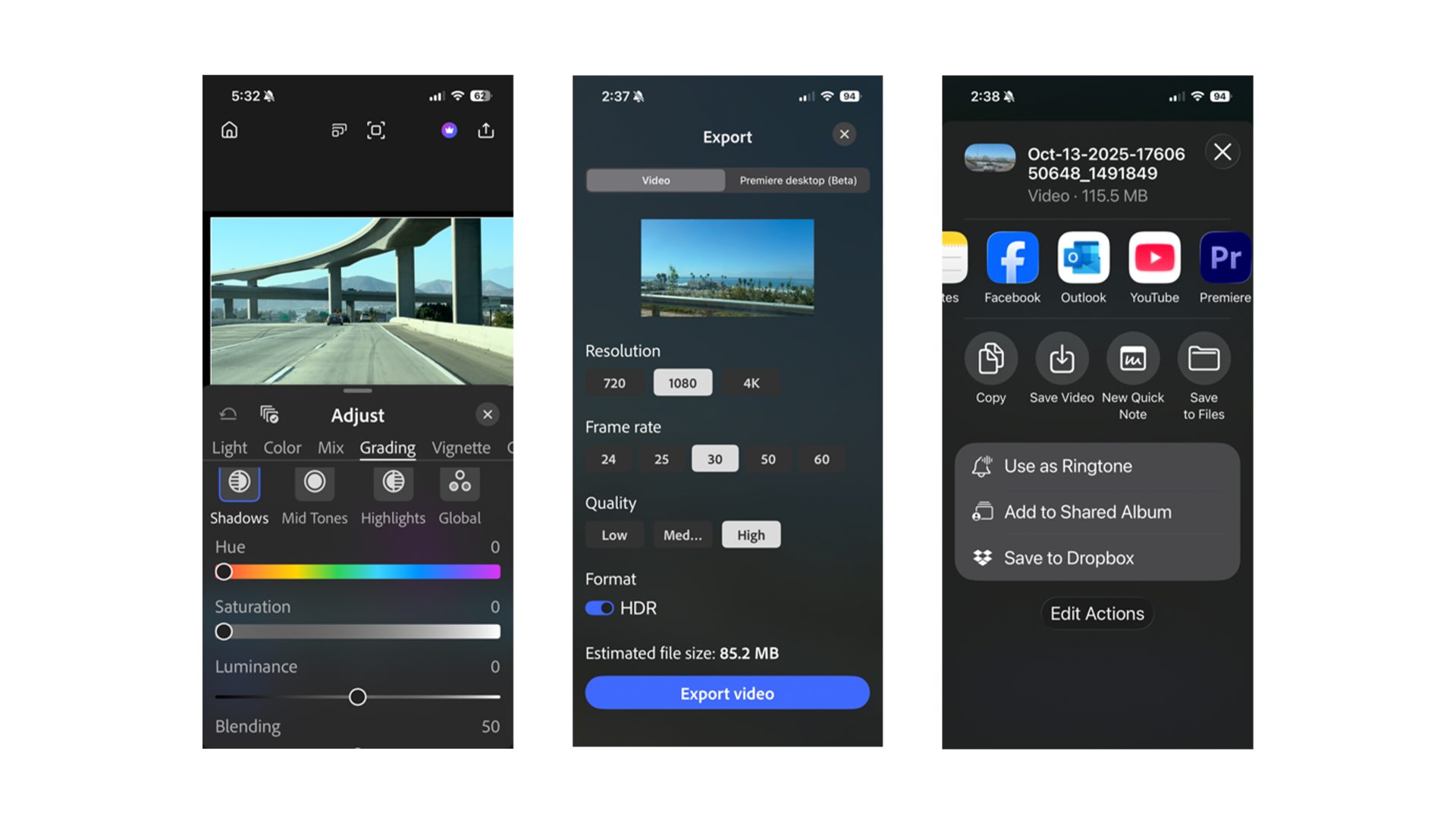 Color work on mobile has historically been a weak link. Not here. Premiere for iPhone offers a Color tab with sliders for temperature, tint, vibrance and saturation. It’s basic, but effective. For deeper control, you can apply Lightroom presets or jump into curves for tonal adjustments. While it doesn’t replicate the full Lumetri Color panel from the desktop, it’s more than enough for social videos and even short films.